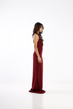 Woman in a black dress standing in a stone-walled room with a view of a cityscape.